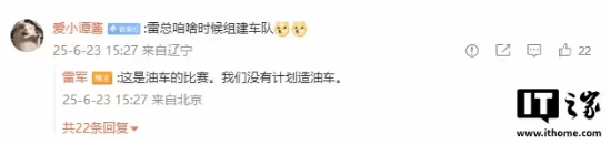 据IT之家消息,今日有网友在小米创办人、董事长兼 CEO 雷军的评论区询问:“雷总,咱啥时候组建车队?”,雷军回复称:“这是油车的比赛