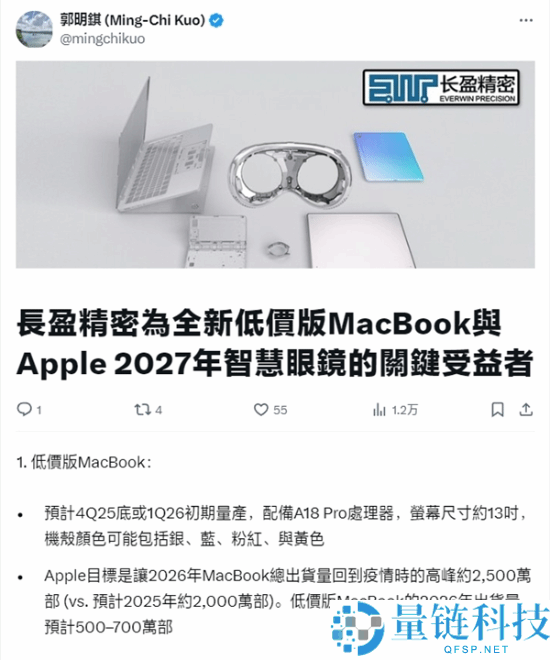 快科技6月30日消息,据知名分析师郭明錤爆料,苹果将首次推出推廉价版MacBook,预计在今年年底,或明年初开始量产,也会在明年正式上市。产