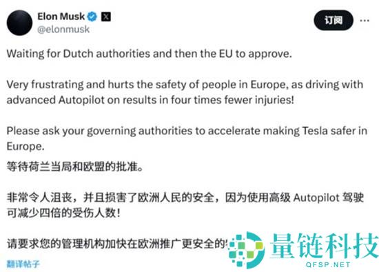 马斯克喊话欧盟快批准FSD 自动驾驶事故率仅为人工驾驶1/4