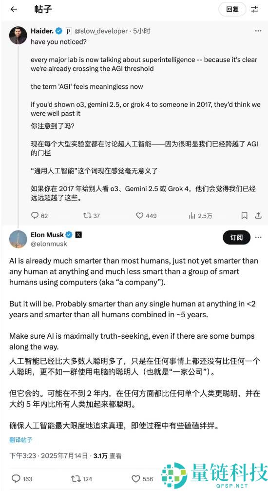 据IT之家报道,马斯克日前在X平台上“疯狂输出”,在回复一名博主Haider有关AGI的观点时表示,AI已经“比大多数人聪明得多”了,但并没有“