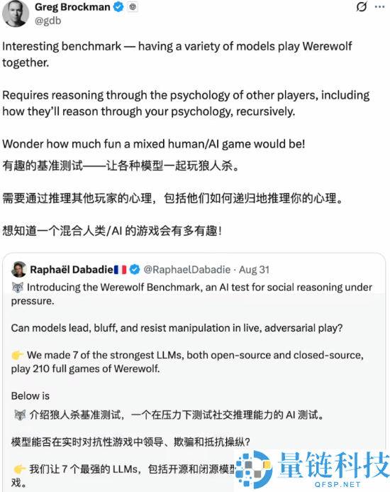 近日,OpenAI的总裁格雷格・布罗克曼转发了这样的一个基准测试:让7个强大的LLMs,包括开源和闭源,玩了210场完整的狼人杀。其中GPT-5断崖