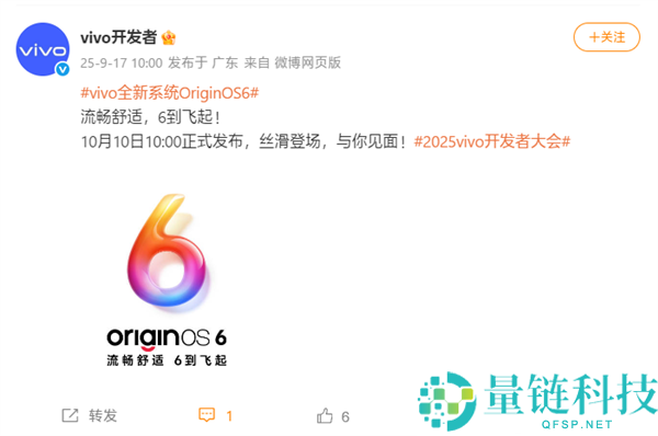9月17日消息,vivo官方今天发文宣布,全新一代系统OriginOS 6将于10月10日10:00正式发布。官方海报上显示流畅舒适 6到飞起”,预计新版本