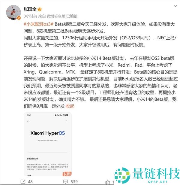 9月4日消息,小米软件部张国全发文表示,澎湃OS 3 Beta版第二版今天已经外发,欢迎大家升级体验,如果没有重大问题,8款机型第二批Beta版
