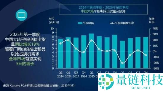 市场调研机构Canalys最新的数据显示,2025年第一季度,中国大陆的平板市场增长非常强劲,出货870万台,同比攀升19%。报告中指出,受持续的
