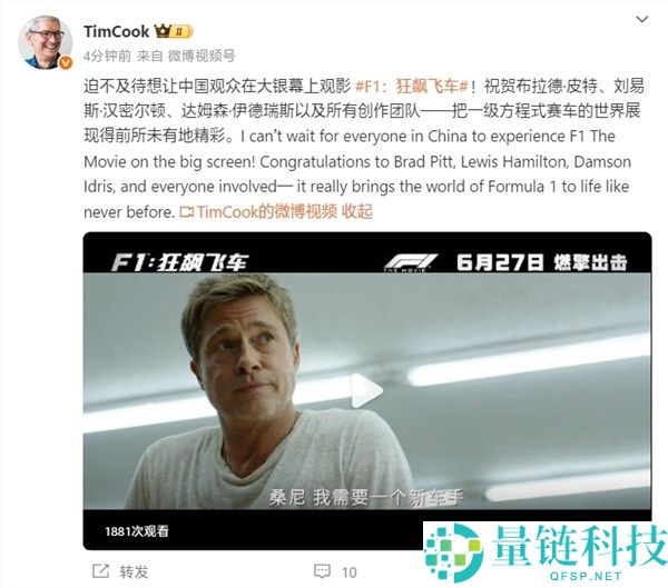 6月26日消息,苹果CEO蒂姆库克今天在微博发文推荐《F1:狂飙飞车》,称迫不及待想让中国观众在大银幕上观影。这是一部苹果花费重金原创打造