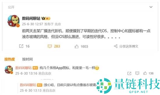 6月30日消息,博主数码闲聊站爆料,有一家国产厂商跟进iOS 26的液态玻璃设计,其迭代OS的控制中心有点像液态玻璃,系统图标和苹果的设计一