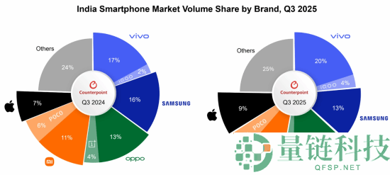 根据Counterpoint Research的《印度智能手机月度追踪报告》,2025年Q3(7-9月)印度智能手机市场出货量同比增长5%,出货金额同比增长18%,