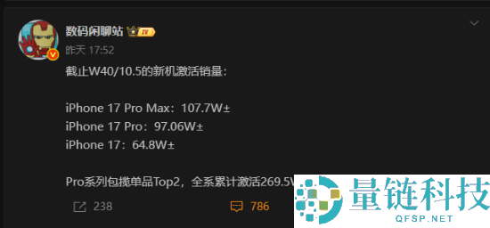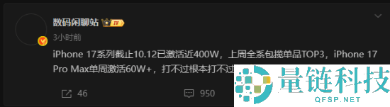 博主 @数码闲聊站 今日发文透露,苹果 iPhone 17 系列截止 10 月 12 日激活近 400 万,上周全系包揽单品 TOP3。另外,iPhone
