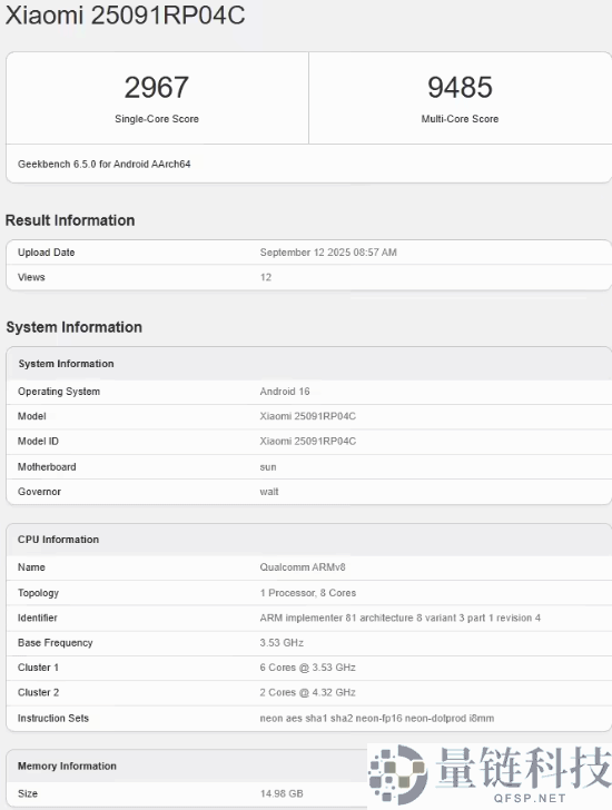 一款型号为25091RP04C的小米新品9月12日现身跑分平台Geekbench,预计为小米平板8 Pro。这款平板在Geekbench 6 5 0版本中取得了单核2967分