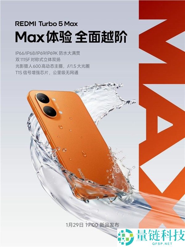 1月26日消息,REDMI Turbo 5系列已经正式官宣,将在1月29日发布,也就是本周四。官方刚刚公布了REDMI Turbo 5 Max阳光橙配色,全方位