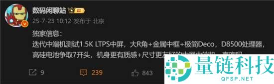 7月23日消息,知名数码博主@数码闲聊站爆料了一款搭载天玑8500芯片的机型,按照外围设计与配置来看,有极大概率是REDMI旗下性能手机Turbo4