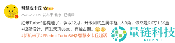 8月4日消息,据博主@智慧皮卡丘 爆料,REDMI Turbo 5进度提速,有望在今年12月发布。据悉,前代REDMI Turbo 4在今年1月发布,首发搭载