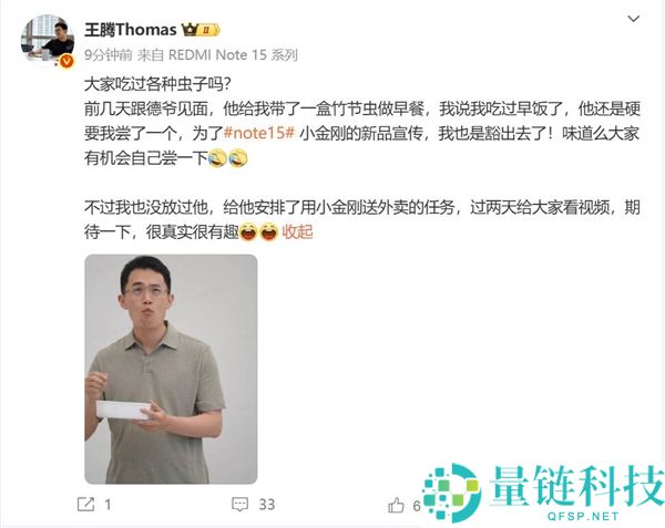 王腾吃虫子:为了REDMI Note 15的新品宣传 我豁出去了