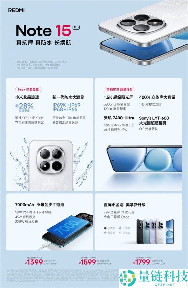 8月21日消息,今日,REDMI Note 15 Pro发布,首销价1399元起。Note 15 Pro看齐Pro 同款品质,包括耐摔、防水、长续航、大音量等。据