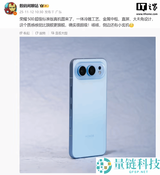 T之家 11 月 12 日消息,博主 @数码闲聊站 今日分享了荣耀 500“超级标准版”的真机图,新机采用一体冷雕工艺 + 金属中框 + 直
