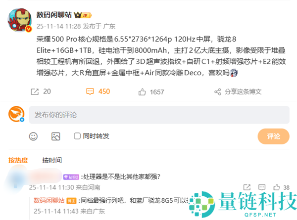 11月14日消息,荣耀500系列即将发布,将推出荣耀500和荣耀500 Pro两款机型。今日,数码博主数码闲聊站”公布了荣耀500 Pro的核心规格,新