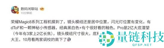 9月4日消息,博主@数码闲聊站 今日爆料称,荣耀Magic 8系列工程机镜头模组还是居中设计,闪光灯位置有变化,配备dToF和一颗神秘小传感器