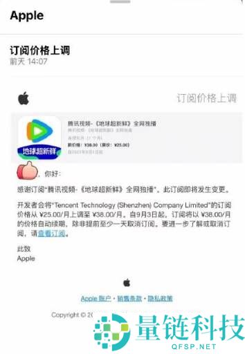 据快科技报道,近日,有多名网友发帖称,收到了苹果方面关于腾讯视频连续包月VIP会员订阅价格上调的通知。根据网友提供的通知显示:“开发