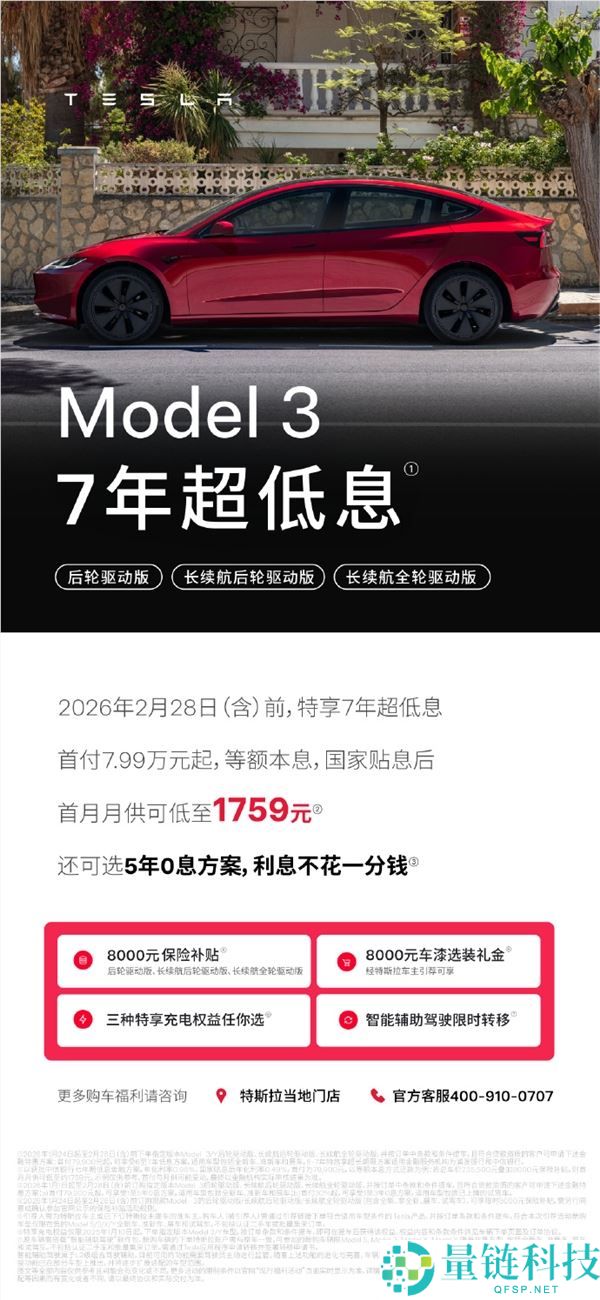 1月24日消息,特斯拉今天宣布Model 3推出重磅购车福利。2026年2月28日前下单的用户,可享8000元保险补贴,叠加7年超低息、车衣选装礼金等