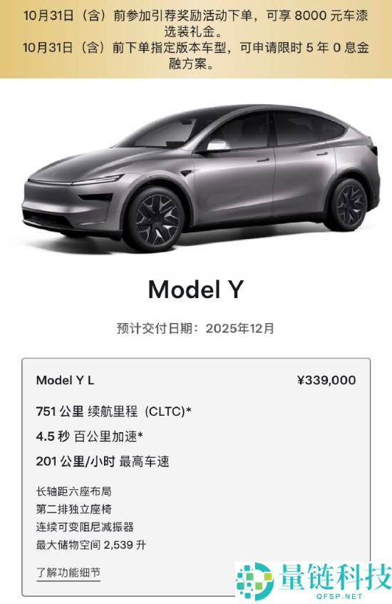 特斯拉今日宣布Model Y L预计交付日期更新为2025年12月:现在下单,年底前提车。即日起至10月31日(含)前参加引荐奖励活动下单,可享8,0