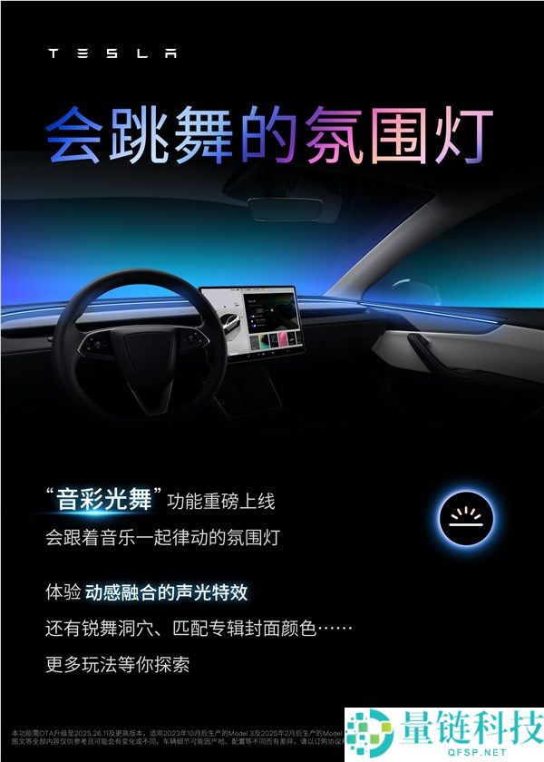10月20日消息,近日,特斯拉通过2025 26OTA软件更新,正式推送音彩光舞”功能。该功能可以让灯光跟着音乐一起律动,让座舱气氛拉满,还有锐
