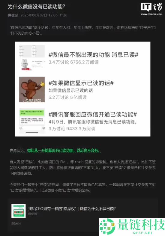 IT之家8月24日消息,“微信派”公众号本月(8月7日)已发文重申,微信从一开始就没有“已读”功能,以后也不会有。然而,博主 @图一乐呵