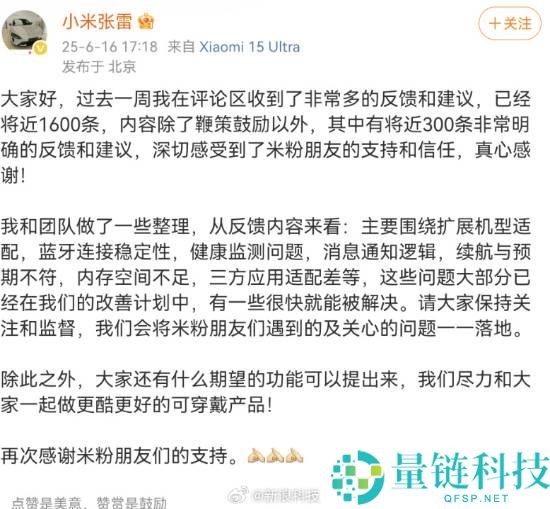 6月16日,小米集团手机部副总裁、可穿戴部总经理@小米张雷在社交媒体发文称,过去一周收到近1600条用户反馈与建议,其中约300条明确反馈涉