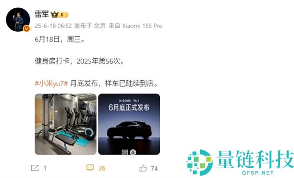 站长之家(ChinaZ com)6月18日 消息:今早,小米创办人、董事长兼CEO雷军在微博发布重要消息,强调小米YU7将于本月底正式发布,且样车已陆