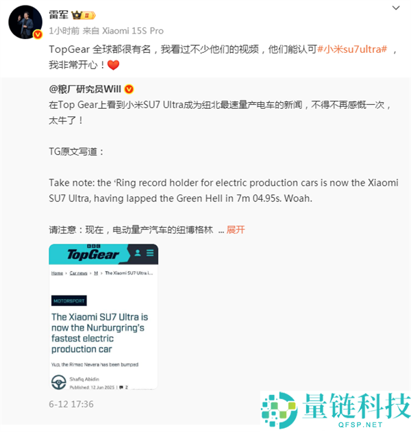 国际汽车媒体TopGear点赞小米SU7 Ultra 纽北记录 雷军:我非常开心