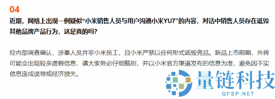 据快科技报道,小米官方表示,他们不会以任何形式诋毁竞品和友商。在小米汽车答网友问里出现了这样的一段问答:“近期,网络上出现一例疑似