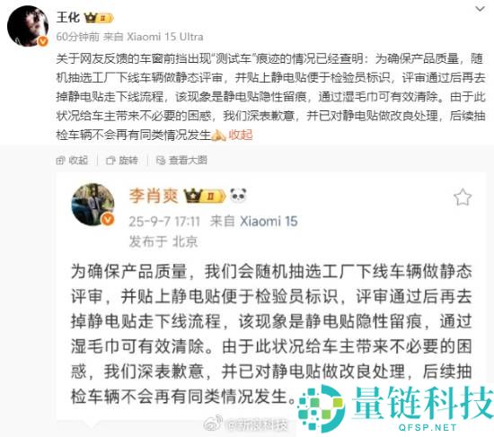 9月7日,小米公关部总经理王化 就网友反馈的车窗前挡出现“测试车”痕迹的情况回应:已经查明:为确保产品质量,随机抽选工厂下线车辆做静