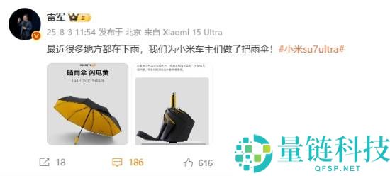 据快科技报道,小米CEO雷军日前在微博发文,称“最近很多地方都在下雨,我们为小米车主们做了把雨伞。”据了解,这把伞为Xiaomi Life晴雨