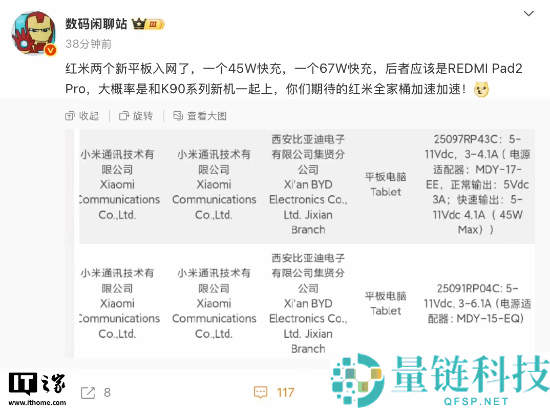 IT之家 8 月 5 日消息,博主 @数码闲聊站 发文,透露小米 REDMI 两款新平板入网,其中前者支持 45W 快充,后者支持 67W 快充,