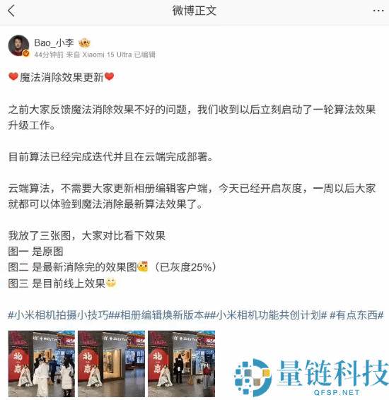 7 月 10 日消息,小米相机部的产品经理 @Bao_小李 今日发文宣布相册的魔法消除效果更新,称收到反馈魔法消除效果不好的问题,并立刻启