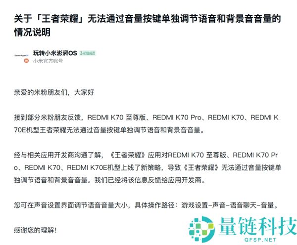 7月29日消息,据小米官方账号玩转小米澎湃OS”在小米社区发布了关于王者荣耀无法通过音量按键单独调节语音和背景音音量的情况说明”。其中