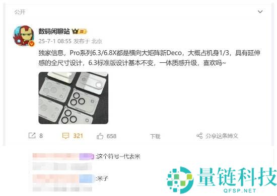 博主数码闲聊站暗示,小米16 Pro系列有两种尺寸,分别是6 3英寸和6 8英寸,两款机型都是采用横向大矩阵相机DECO,大概占据了机身三分之一