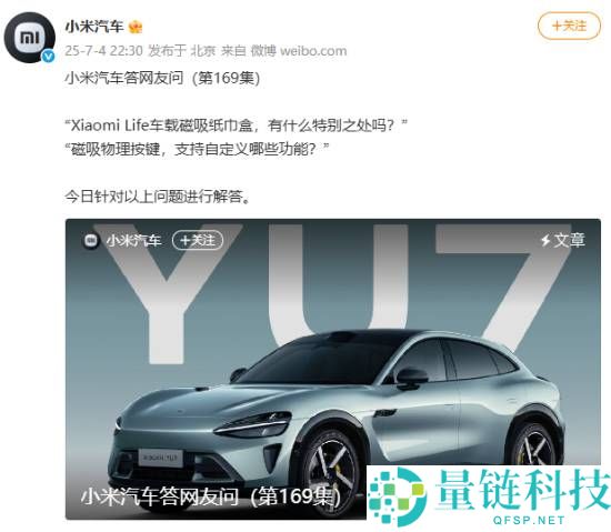 今日晚间,小米汽车官方发布了“小米汽车答网友问(第169集)”,回答了“Xiaomi Life车载磁吸纸巾盒,有什么特别之处吗?”、“磁吸物理