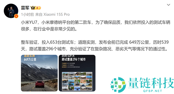 雷军:YU7是小米摩德纳平台第二款车 小米投入测试车辆行业罕见