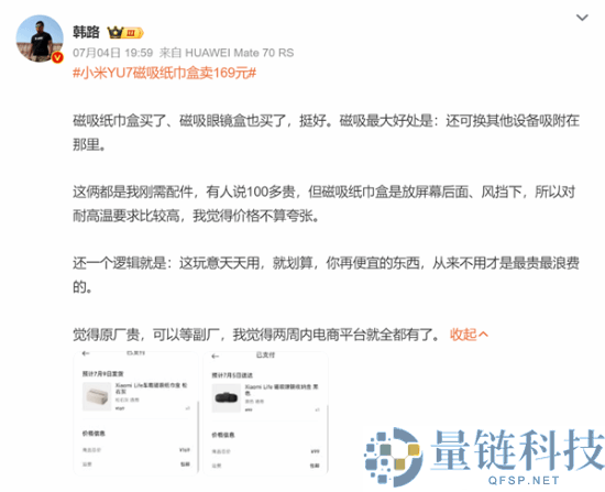 快科技7月5日消息,YU7磁吸纸巾盒卖169元这件事被冲上了热搜,在雷军看来这个价格真不贵,因为成本居高。按照小米官方的说法,相比于普通纸