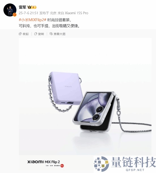 7月6日,小米创办人、董事长雷军在微博发布动态,宣传小米MIX Flip 2的全新时尚挂链套装,并配文:“可斜挎,也可手提,出街吸睛又便捷。