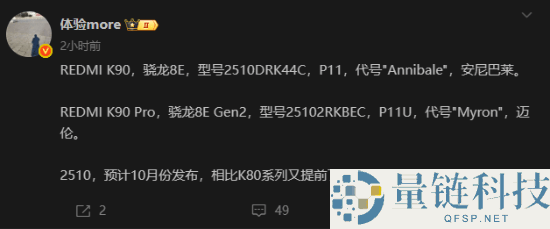 曝小米REDMI K90预计10月发布 骁龙8至尊版处理器
