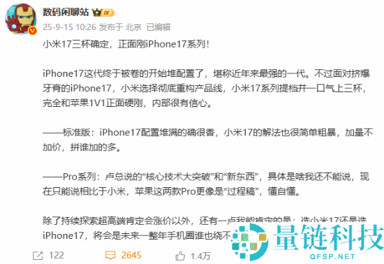 正面刚苹果!博主:选小米17还是iPhone 17将是未来一年最热话题