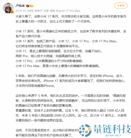 小米集团合伙人、总裁,手机部总裁,小米品牌总经理卢伟冰今日发文宣布:这次小米17系列官宣后非常受欢迎,刚刚同事和我分享:截至昨天,小
