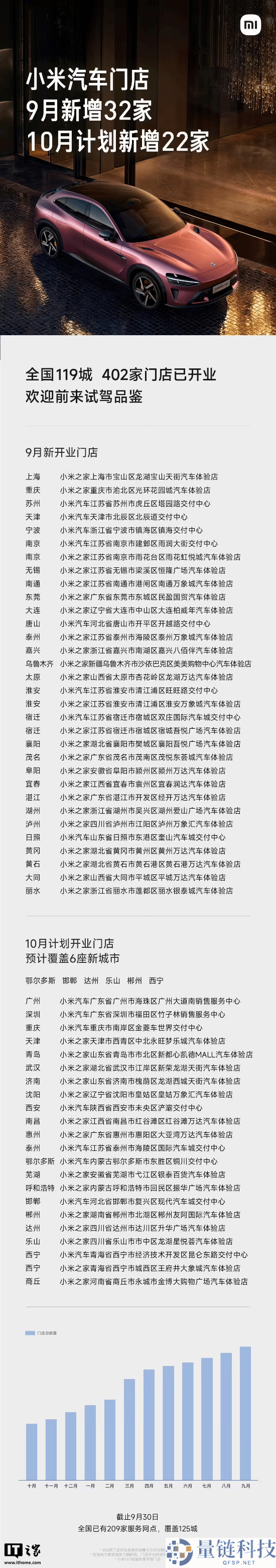 9 月 30 日消息,小米汽车官方今日汇报了开店新进展:·9 月新增 32 家门店,全国 119 城已有 402 家门店;·10 月计划新增 22