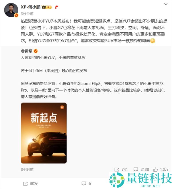 6月23日消息,今日,小米CEO雷军宣布,小米汽车首款SUV车型小米YU7将在6月26日(本周四)正式发布。小鹏汽车董事长何小鹏转发雷军官宣微博