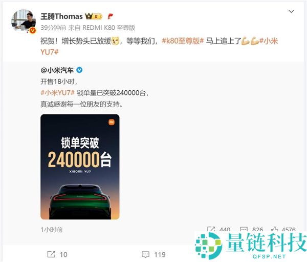 小米YU7锁单量已突破240000台 王腾:REDMI K80至尊版销量马上追上