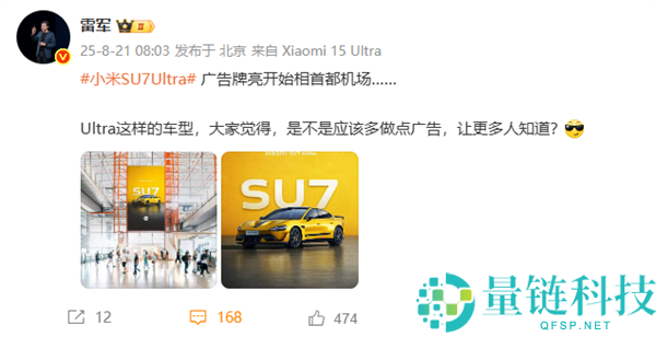 8月21日消息,今天早上,小米雷军在个人微博宣布,小米SU7 Ultra广告牌正式亮相首都机场。雷军还以互动口吻向网友提问:Ultra 这样的车型