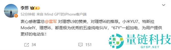 李想,感激雷军歌颂抱负L9、推荐抱负i6 “67Y”一路加电