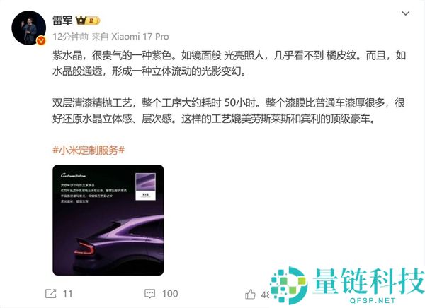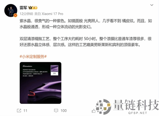 10月8日消息,小米创办人雷军介绍了小米YU7的定制色紫水晶。雷军指出,紫水晶是一种很贵气的一种紫色,如镜面般光亮照人,几乎看不到橘皮纹