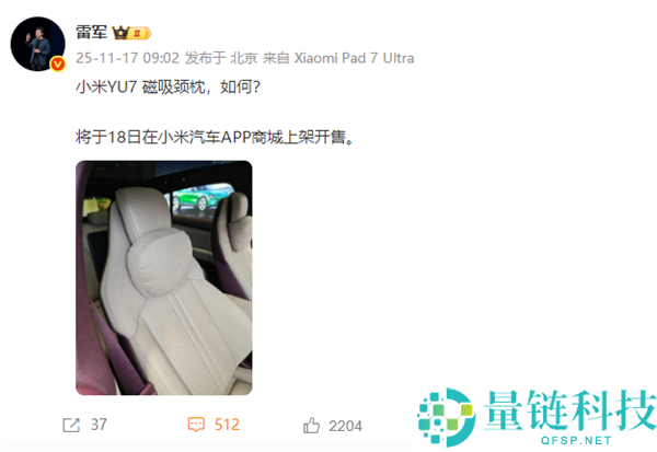 11月17日消息,今日上午,小米集团创始人、董事长兼 CEO 雷军宣布:小米 YU7 磁吸颈枕将于 18 日(即明天)在小米汽车 App 商城上